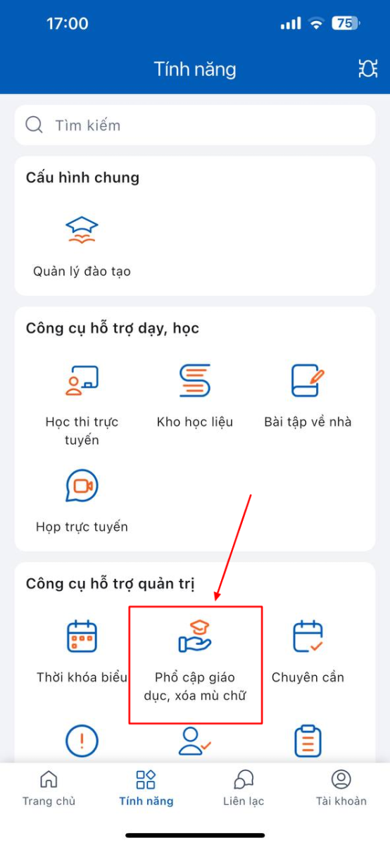 Bước 2: Touch chọn tính năng > Tại phần tiện ích chọn Phổ cập giáo dục