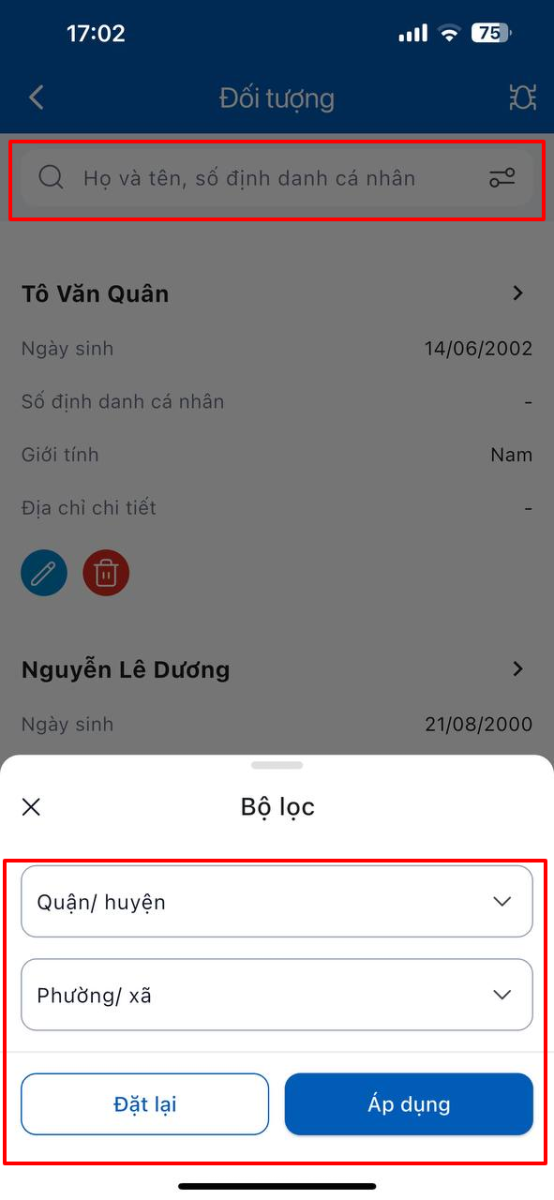 Danh sách > Bộ lọc: Nhập / chọn dữ liệu > Click button Tìm kiếm > Danh sách trả về kết quả theo tiêu chí đã nhập /chọn