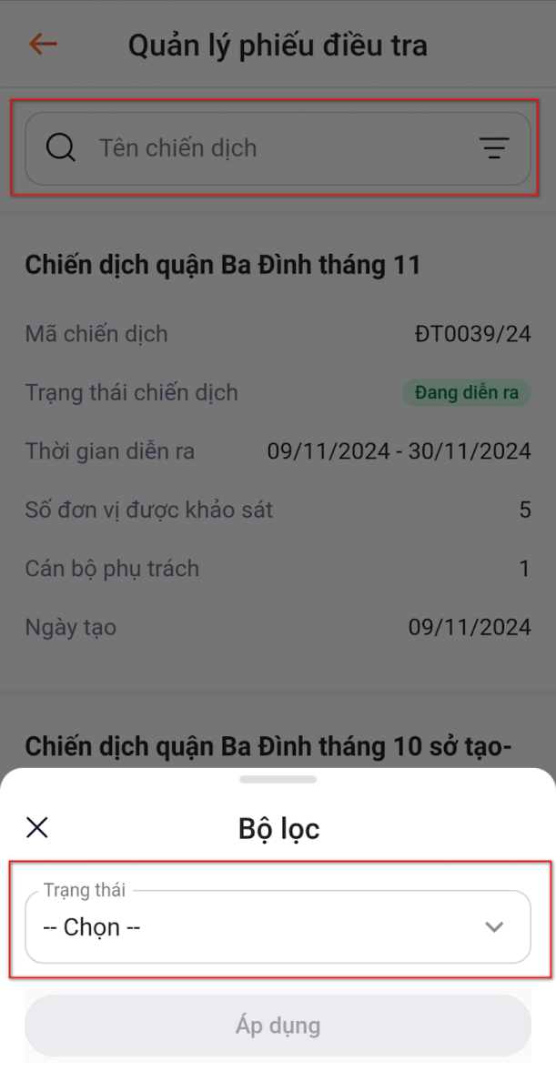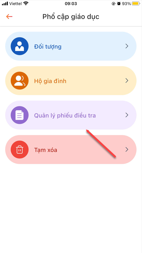 Bước 1: Danh sách chức năng > Touch Quản lý phiếu điều tra