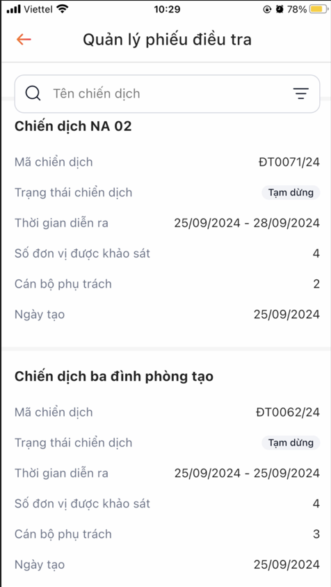 Bước 2: Hiển thị màn hình danh sách các phiếu điều tra của đơn vị