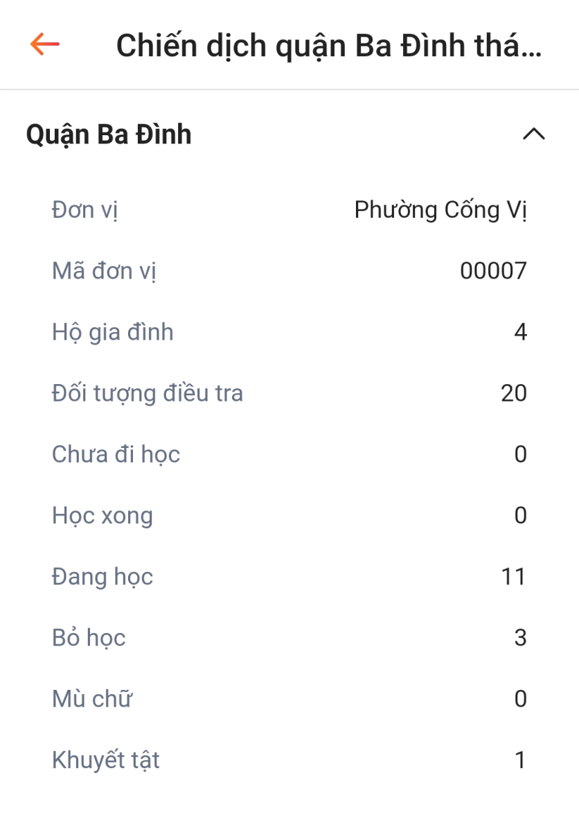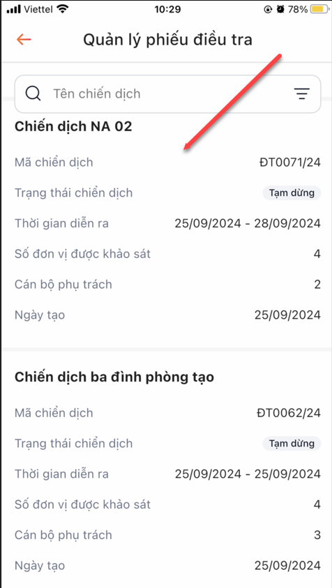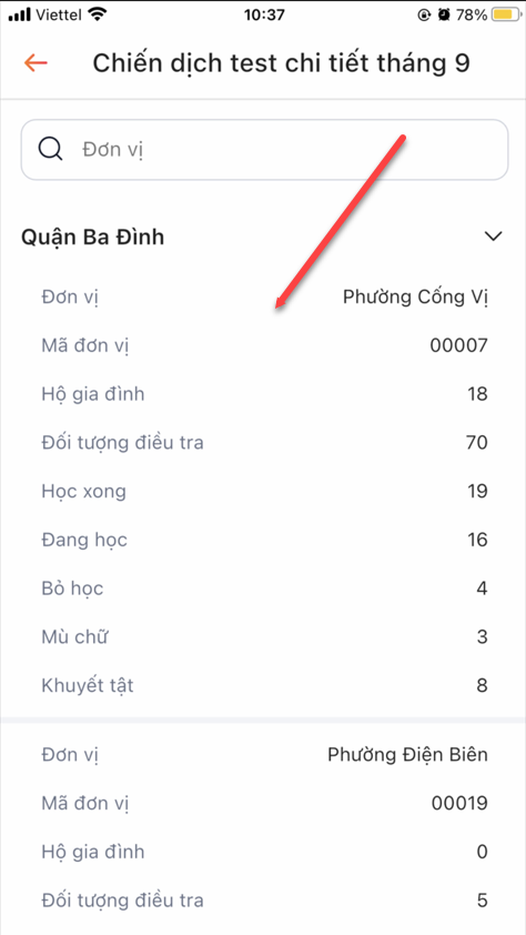Bước 1: Danh sách các đơn vị tham gia điều tra > Touch 1 đơn vị