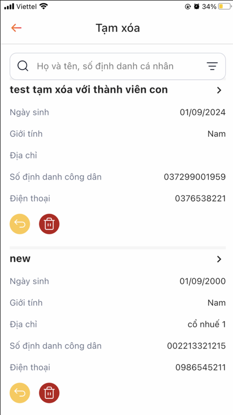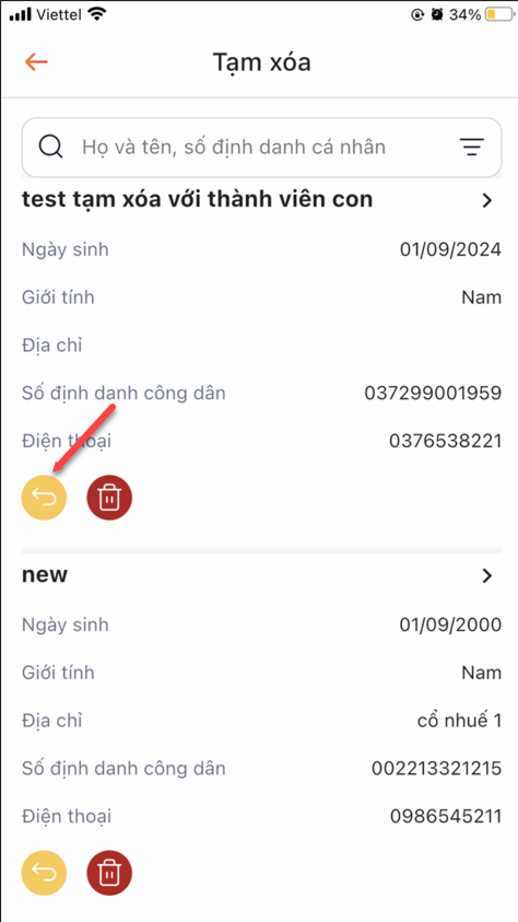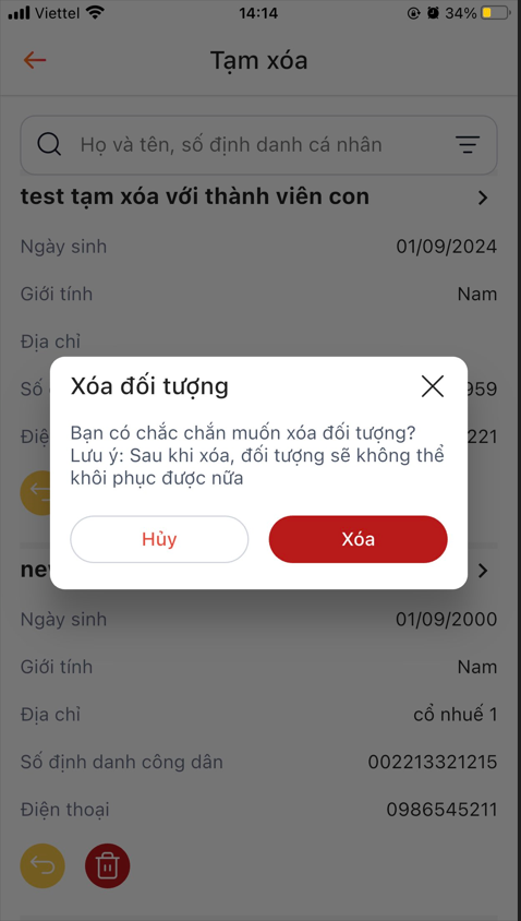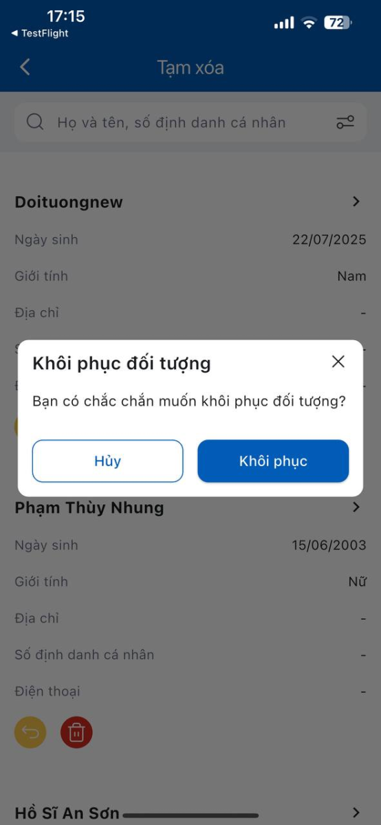 Bước 2: Hiển thị form xác nhận > Touch khôi thục thực hiện khôi phục đối tượng thành công