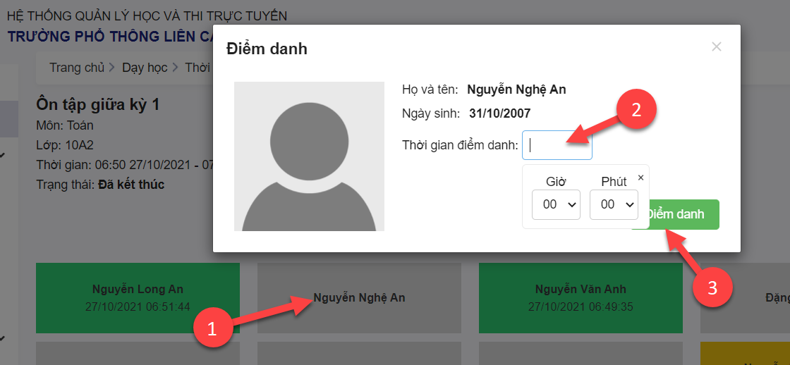 Bước 2: Nhập thời gian điểm danh cho học sinh đó. Lưu ý: Thời gian điểm danh phải nằm trong khoảng thời gian diễn ra của lớp học ảo.