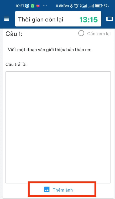 Bước 4: Tại câu hỏi, học sinh có thể click vào nút Thêm ảnh để thực hiện chụp ảnh bài làm rồi đưa lên hệ thống.