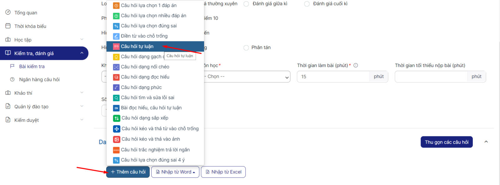 Bước 3: Vào phần Thêm câu hỏi => Chọn Câu hỏi dạng tự luận để thêm mới câu hỏi dạng tự luận.