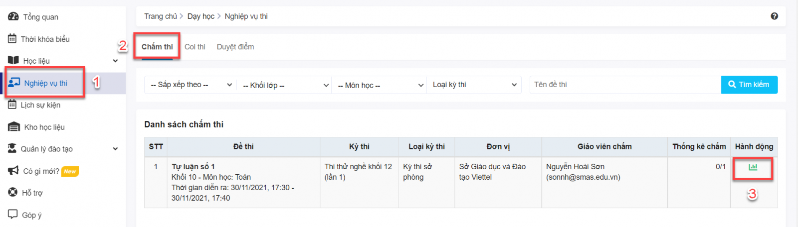 Bước 2: Giáo viên tìm đề thi được phân công chấm và xem báo cáo chấm thi.