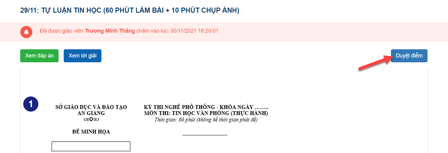 - Quan sát lại bài và nhấn Duyệt điểm => Đồng ý nếu muốn duyệt điểm tại bài của giáo viên khác đã chấm thi. Sau khi xác nhận sẽ hiển thị Giáo viên duyệt bài của Giáo viên đó tại cột Duyệt trong menu Nghiệp vụ thi.