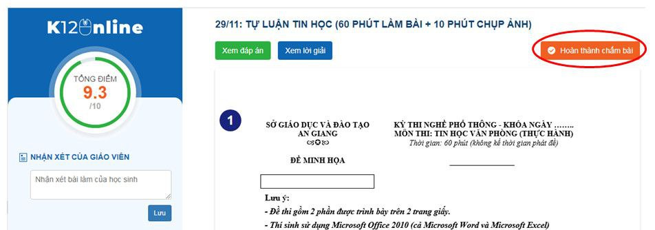Bước 6: Nếu đã chính xác hết rồi, giáo viên nhấn vào nút Hoàn thành chấm bài (ở góc bên phải trên cùng) để kết thúc quá trình chấm thi cho bài đó.