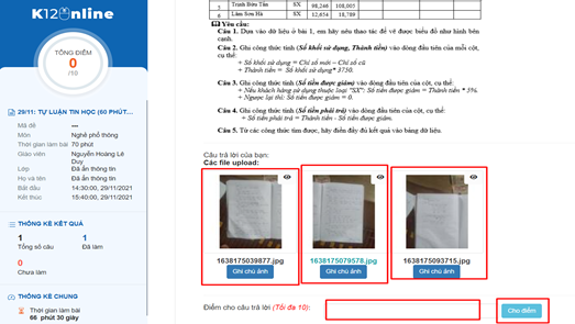 - Với mỗi một câu hỏi đều có phần Cho điểm, giáo viên nhập số điểm cho câu hỏi đó và nhấn nút Cho điểm để hệ thống ghi nhận điểm cho bài thi.