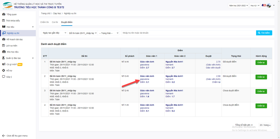 - Trong trường hợp giáo viên muốn kiểm tra bài của các giáo viên khác đã chấm trước đó và duyệt, giáo viên click vào 1 điểm tại cột Giáo viên chấm trong cột Điểm để xem chi tiết bài thi do giáo viên khác đã chấm.