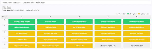 - Hệ thống sẽ ghi nhận lần điểm danh trong lần đầu tiên học sinh vào học, giáo viên có thể tải lại trang (F5) để xem kết quả mới nhất.