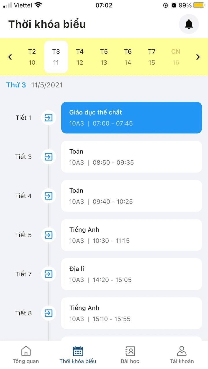 Mỗi học sinh có một thời khóa biểu của riêng mình. Tại đây, học sinh có thể xem được lịch học/kiểm tra nếu giáo viên gán vào thời khóa biểu.