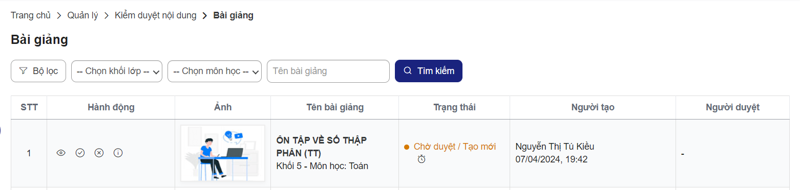 Vào Kiểm duyệt nội dung => Chọn Bài giảng => Chọn bài giảng cần kiểm duyệt => Click Duyệt/Từ chối.