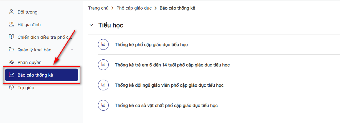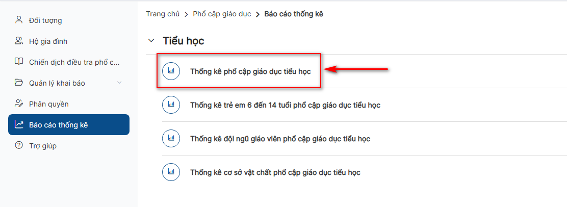 Bước 1: Menu Báo cáo thống kê > Danh mục Tiểu học > Chọn Thống kê phổ cập giáo dục tiểu học