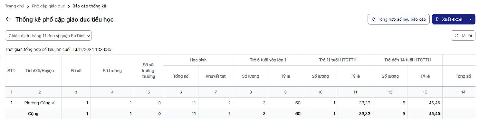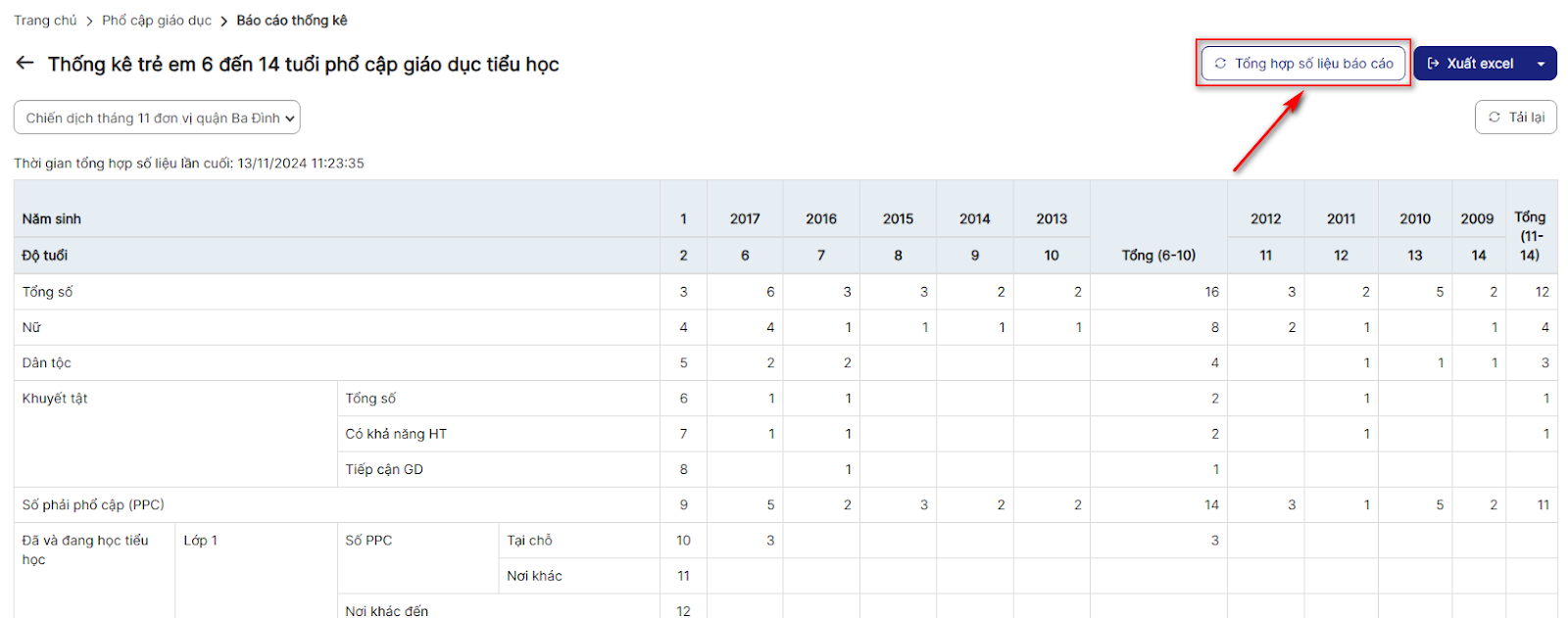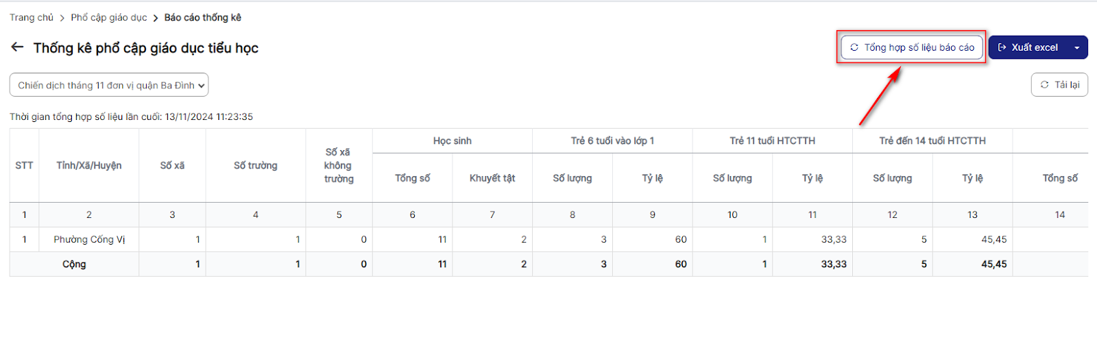 Bước 1: Danh sách > Click button Tổng hợp số liệu báo cáo