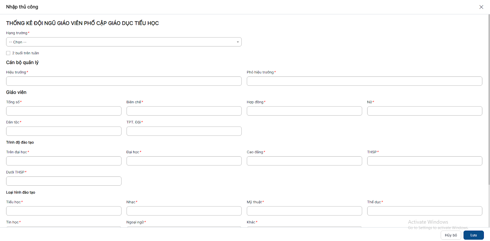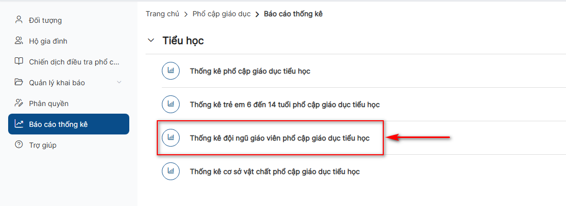 Bước 1: Menu Báo cáo thống kê > Danh mục Tiểu học > Chọn Thống kê đội ngũ giáo viên phổ cập giáo dục tiểu học
