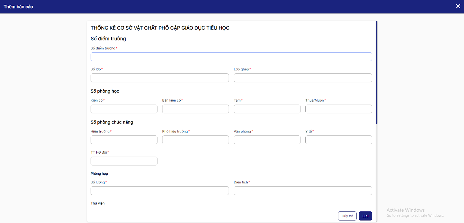 Bước 1: Menu Báo cáo thống kê > Danh mục Tiểu học > Chọn Thống kê cơ sở vật chất phổ cập giáo dục tiểu học