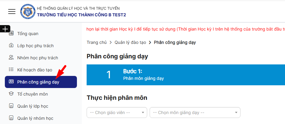 Bước 2:Trên thanh menu trái nhấn module Phân công giảng dạy