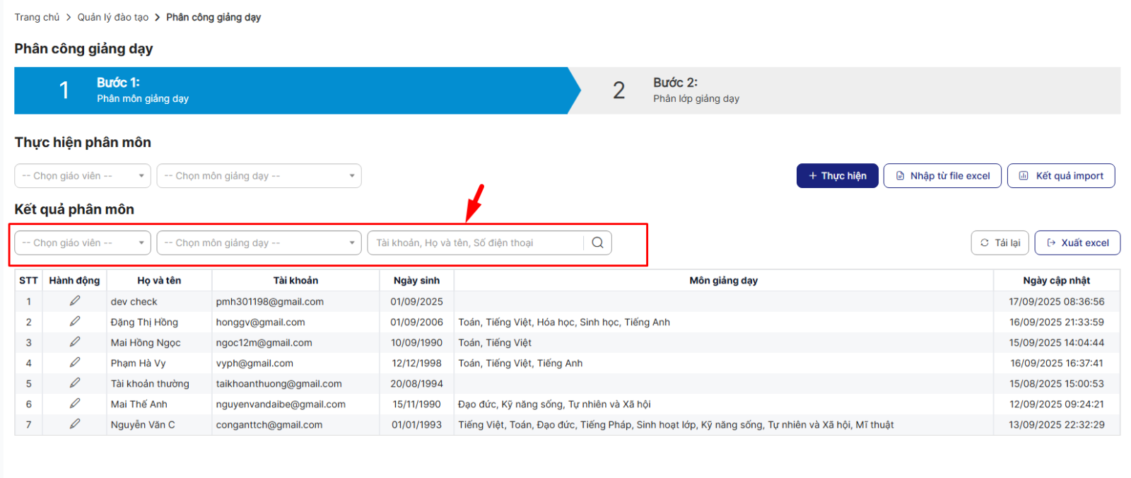 Bước 2: Bộ lọc: Nhập / chọn dữ liệu > Danh sách trả về kết quả phân môn