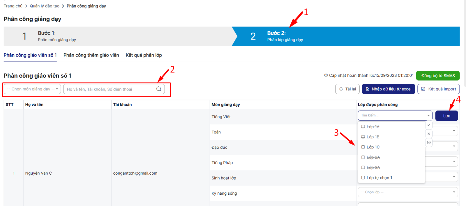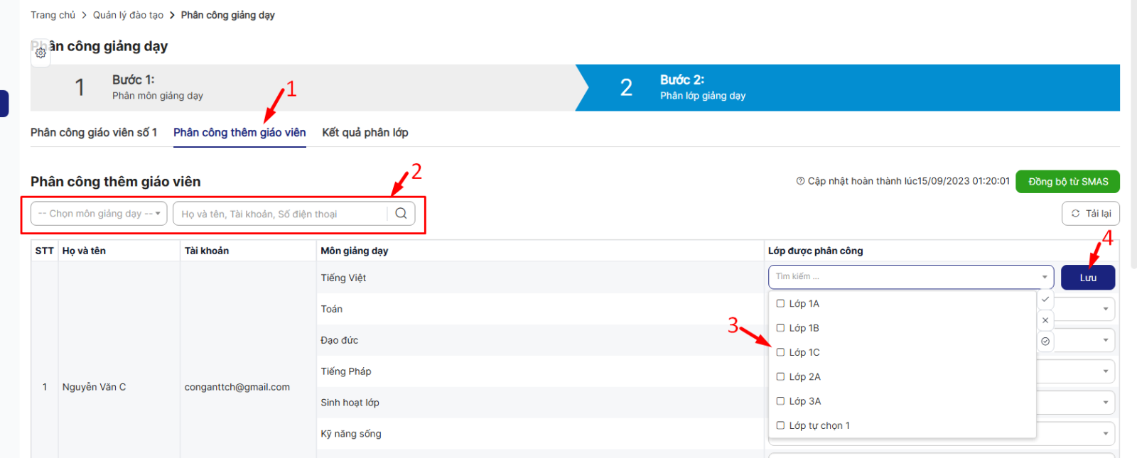 Bước 1: Nhấn vào bước 2 > chọn môn giảng dạy > Nhập tên giáo viên > Chọn lớp > Nhấn lưu để thực hiện phân lớp giảng dạy