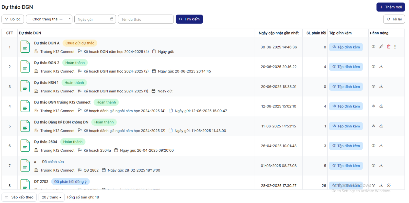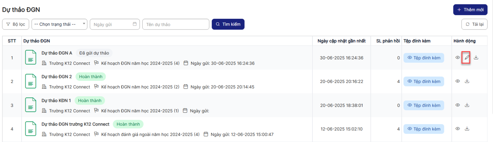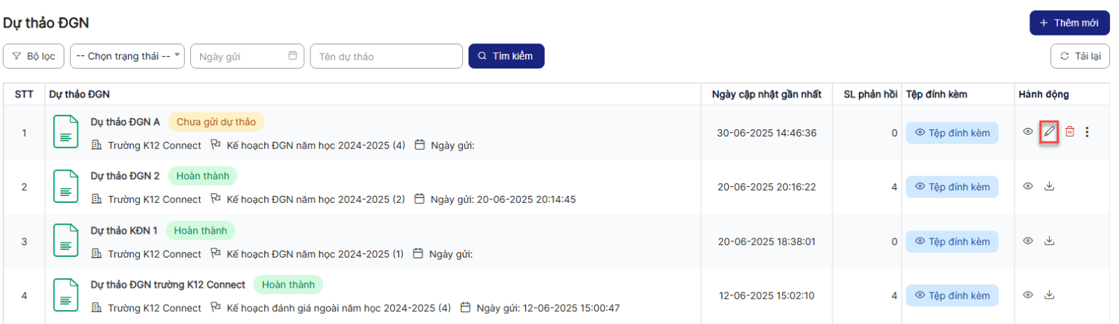 Bước 1: Trên màn hình danh sách> Click icon Chỉnh sửa của 1 bản ghi ở trạng thái chưa gửi dự thảo