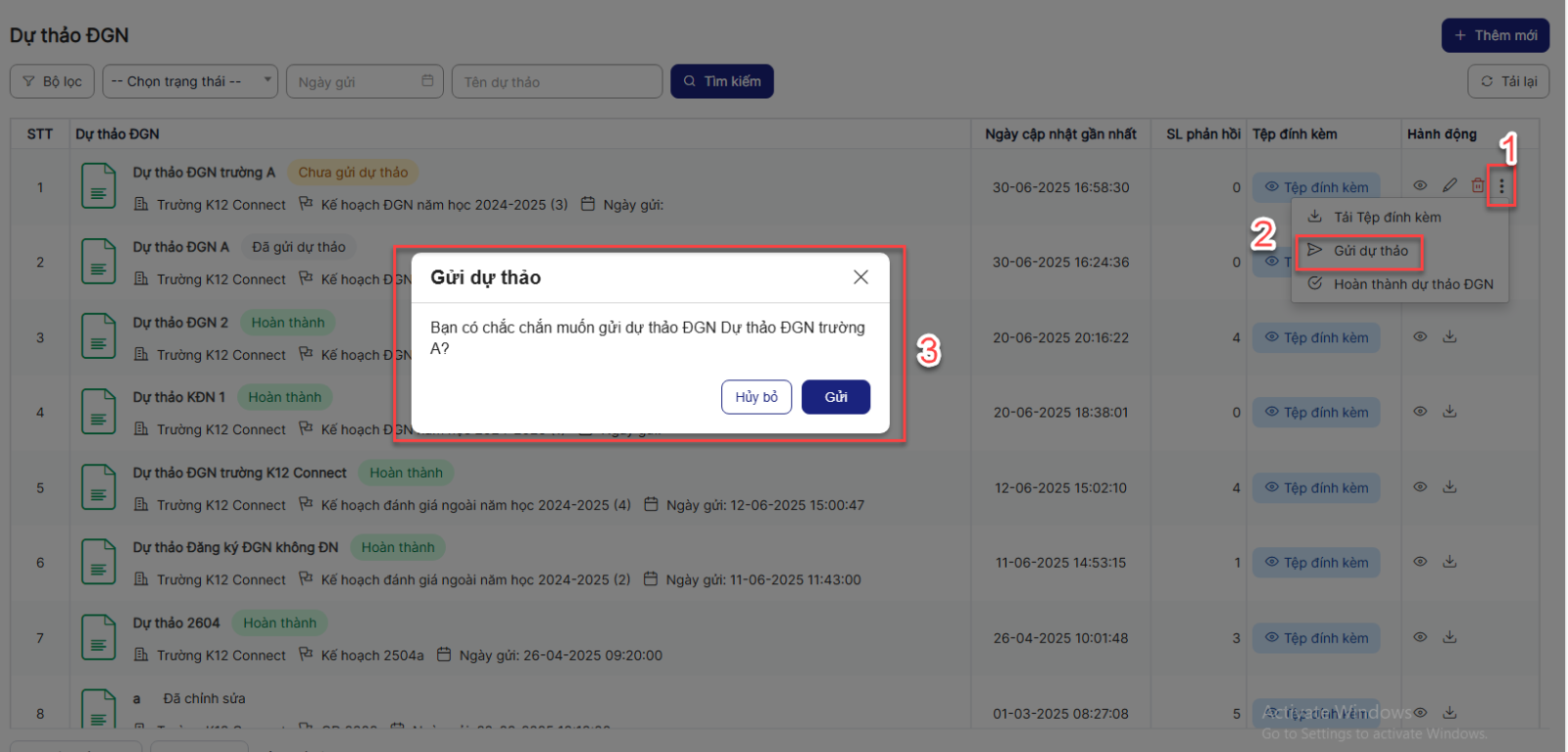 Bước 1: Trên màn hình danh sách > Click icon gửi dự thảo 1 bản ghi > Hệ thống hiển thị popup xác nhận gửi dự thảo