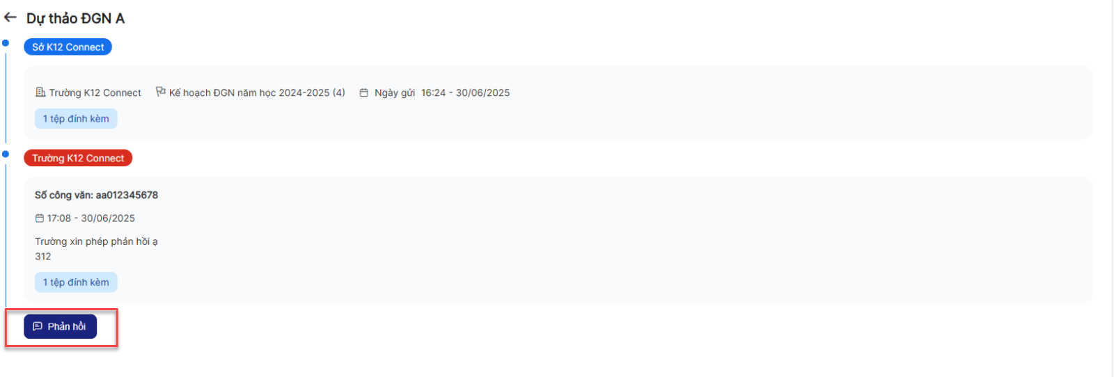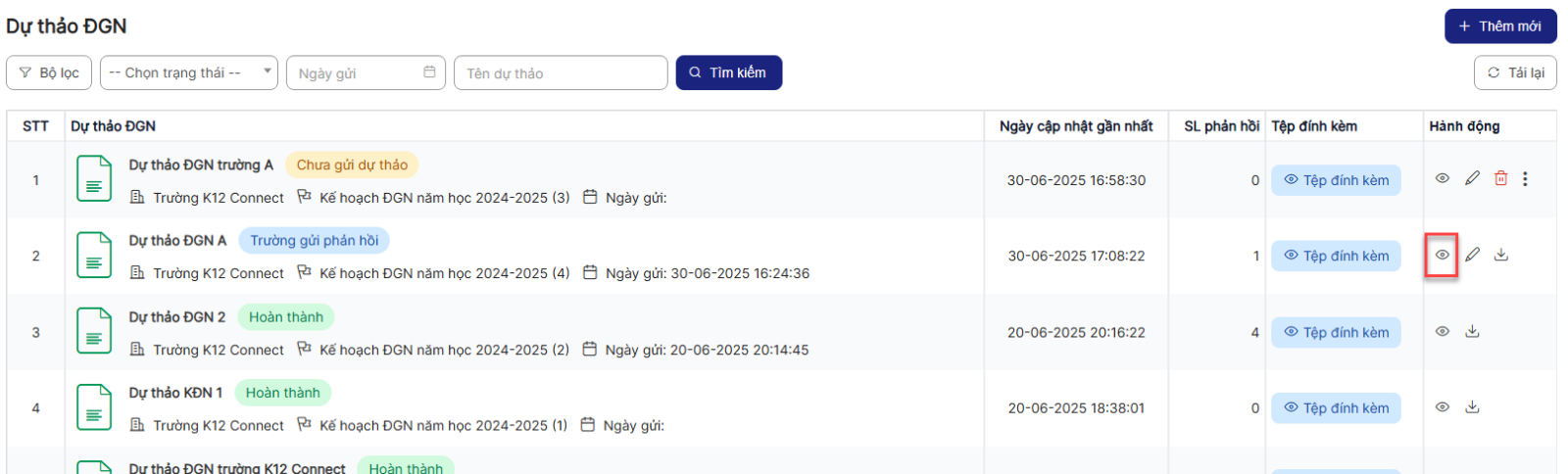 Bước 1: Trên màn hình danh sách > Click icon xem chi tiết 1 bản ghi ở trạng thái trường phản hồi