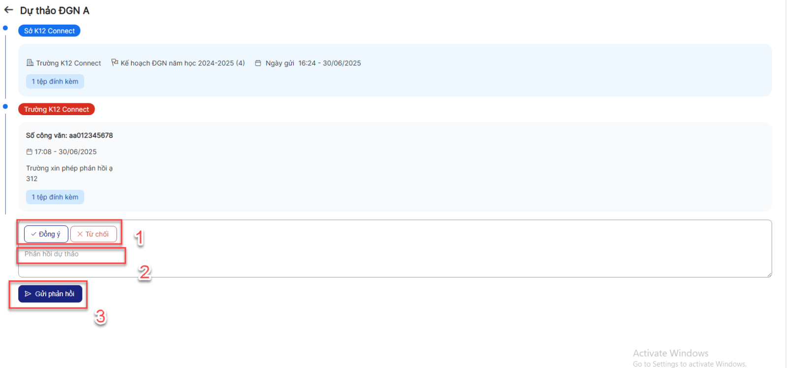 Bước 3: Trên màn hình > Click Đồng ý hoặc Từ chối > nhập phản hồi dự thảo > click Gửi phản hồi
