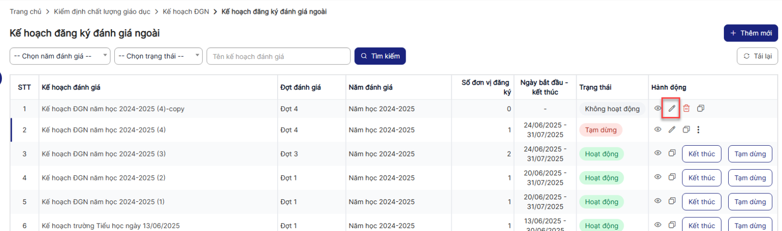 Bước 1: Trên màn hình danh sách> Click icon Chỉnh sửa của 1 bản ghi không hoạt động
