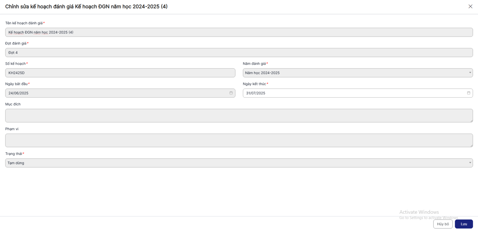 + Tên kế hoạch đánh giá: Bắt buộc nhập, tối đa 255 ký tự