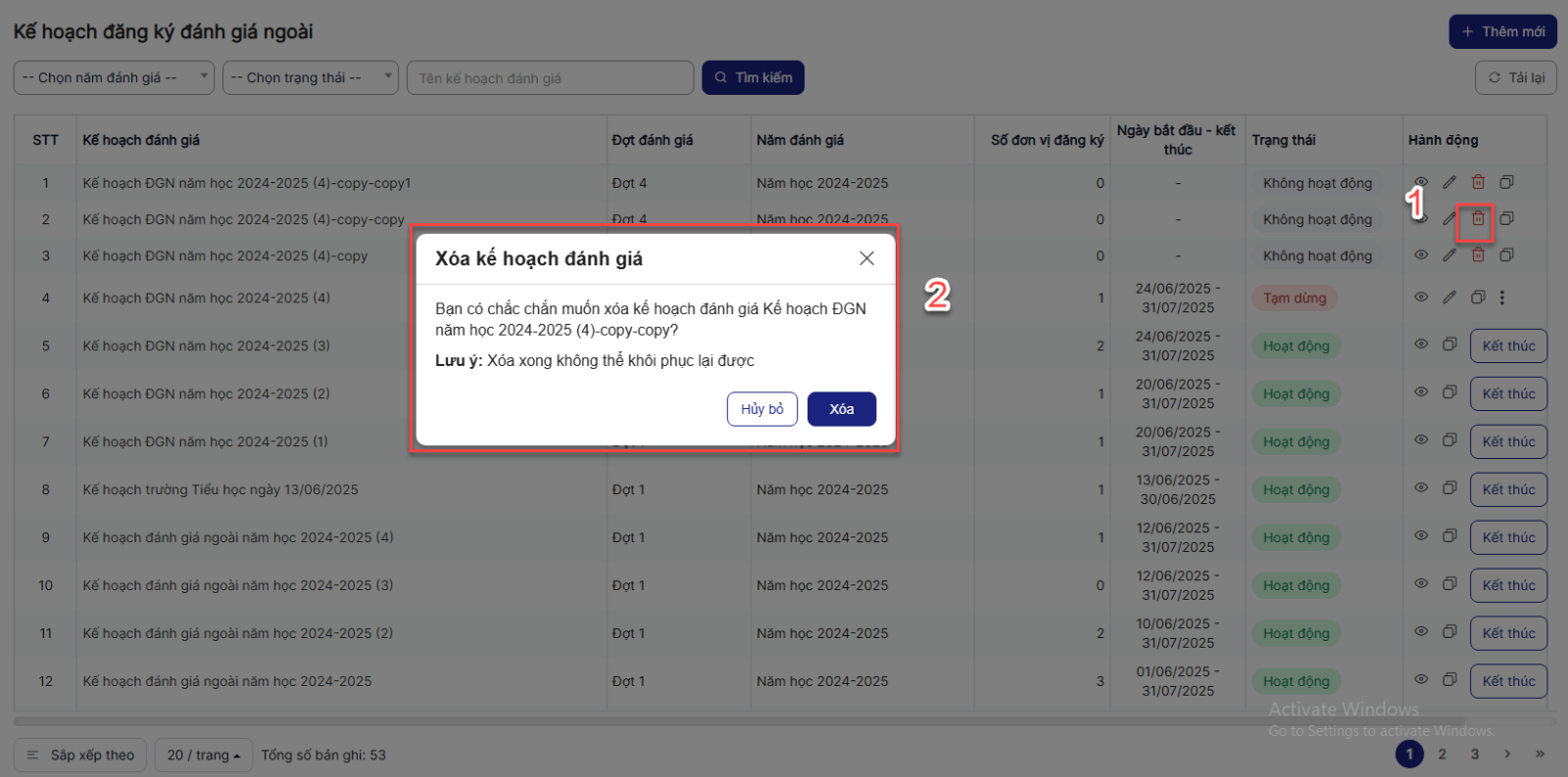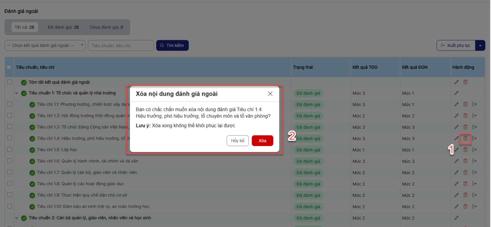 1.4. Xóa Kế hoạch đăng ký đánh giá ngoài