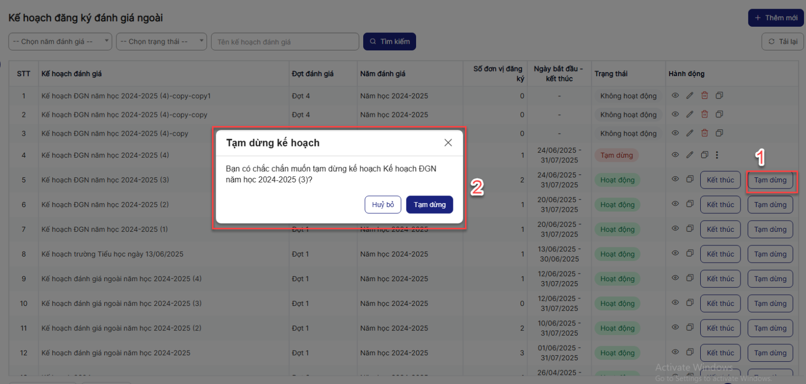 1.5. Tạm dừng Kế hoạch đăng ký đánh giá ngoài