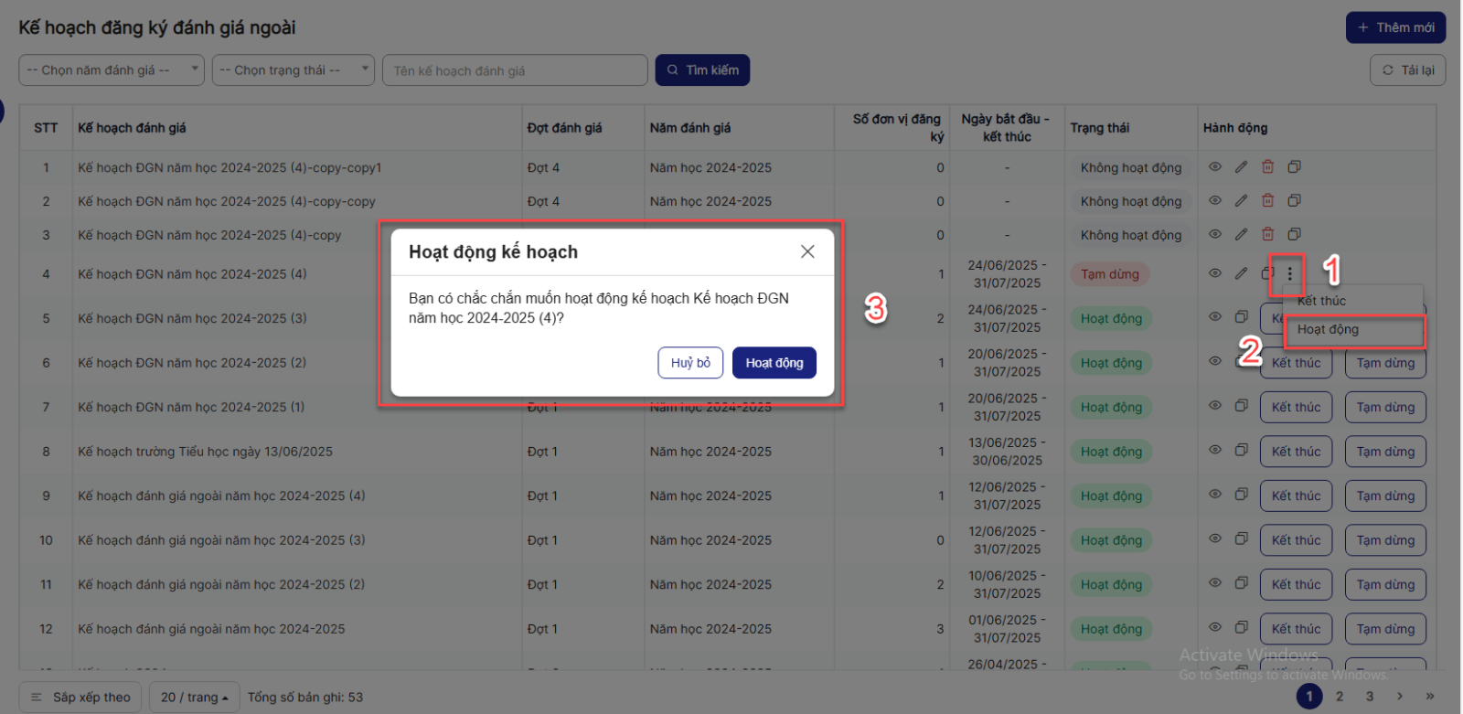Bước 1: Trên màn hình danh sách > Click hoạt động một bản ghi > Hệ thống hiển thị popup xác nhận hoạt động