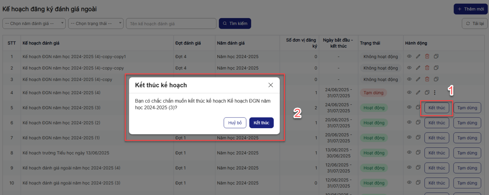 Bước 1: Trên màn hình danh sách > Click kết thúc một bản ghi > Hệ thống hiển thị popup xác nhận kết thúc