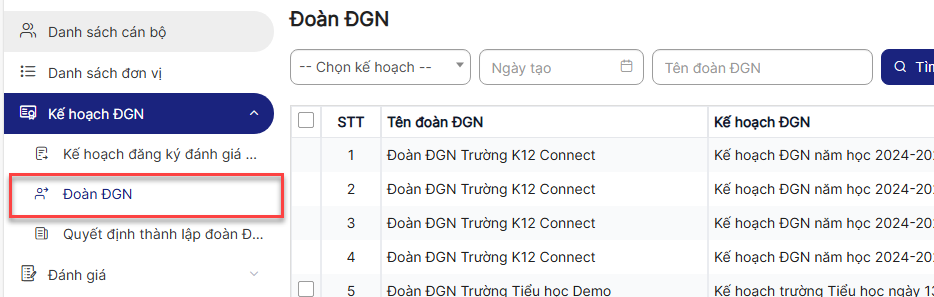 Bước 3: Click menu Kế hoạch ĐGN > Đoàn ĐGN