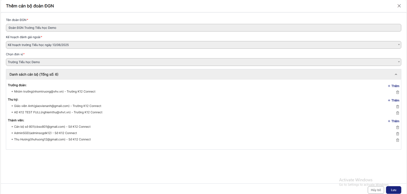 + Trưởng đoàn: Bắt buộc nhập, chỉ được chọn 1