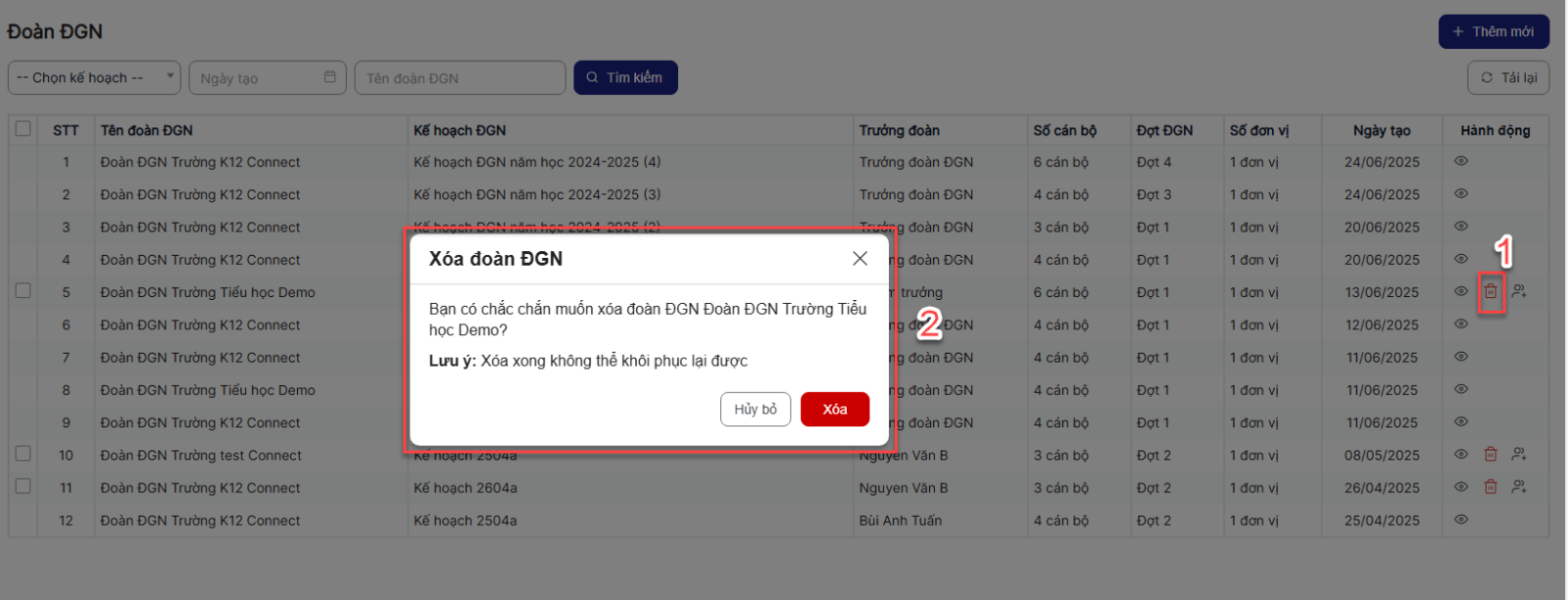Bước 1: Trên màn hình danh sách > Click icon xóa một bản ghi > Hệ thống hiển thị popup xác nhận xóa