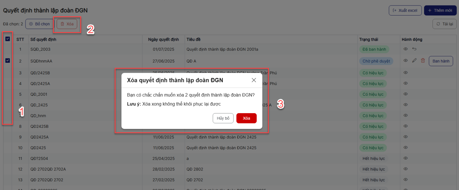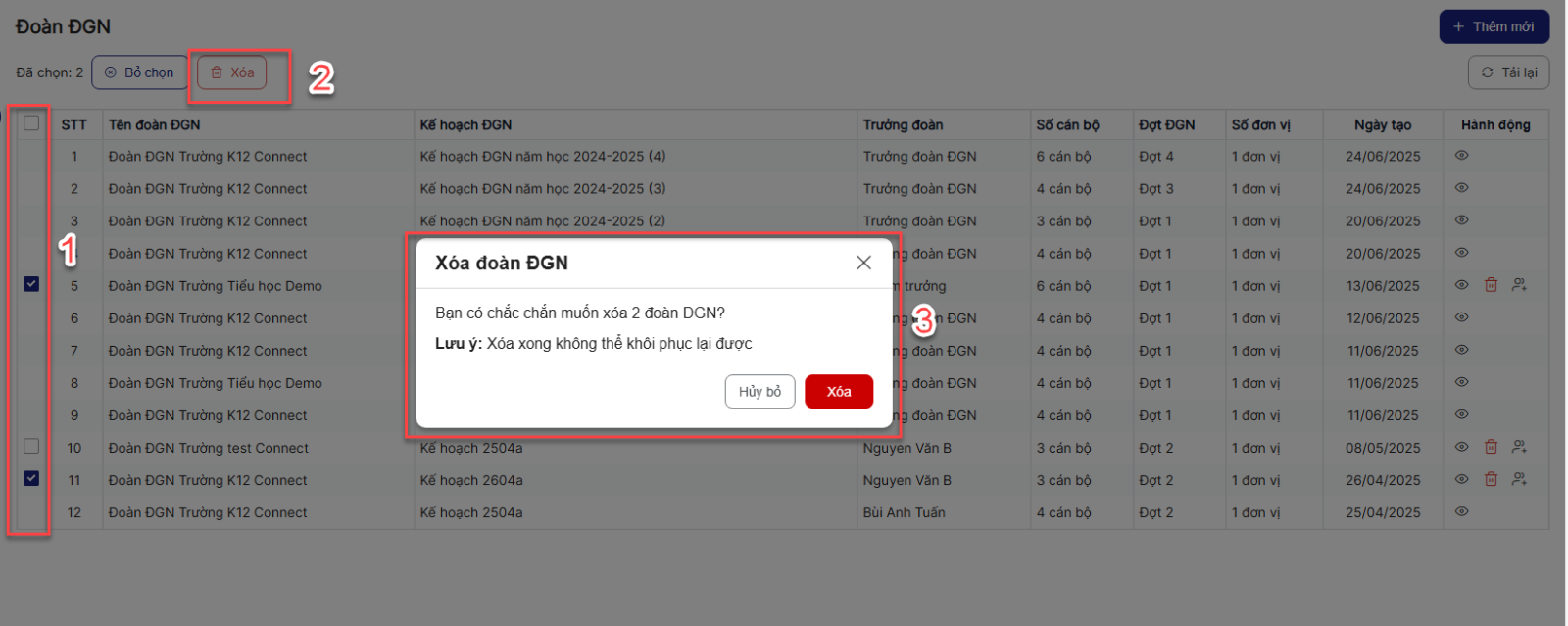 Bước 1: Trên màn hình danh sách > tích chọn checkbox các bản ghi muốn xóa > click Xóa > Hệ thống hiển thị popup xác nhận xóa