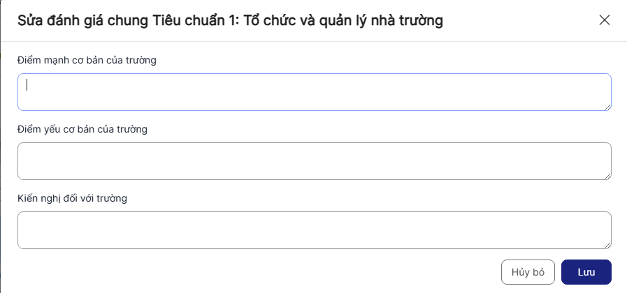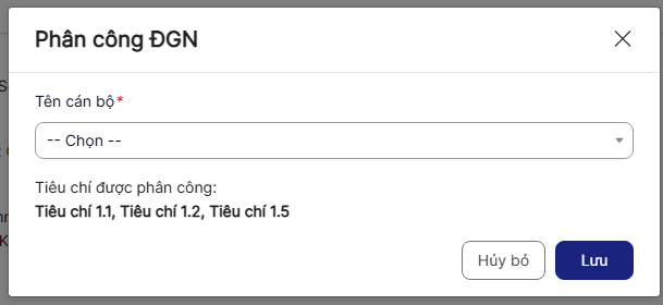 Bước 2: Hiển thị màn hình đánh giá tiêu chí > Thực hiện nhập các trường thông tin, trong đó các trường có dấu (*) là bắt buộc nhập.