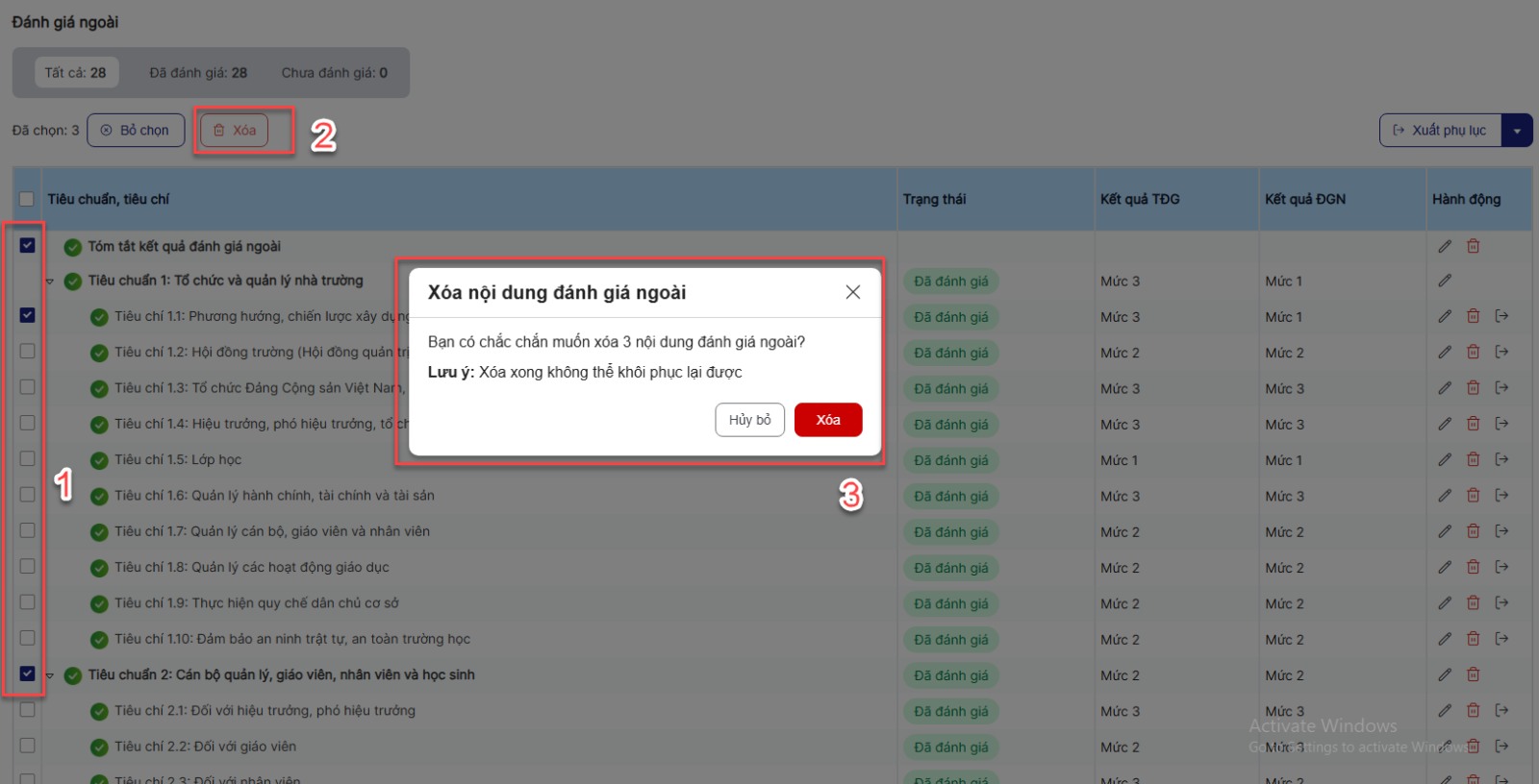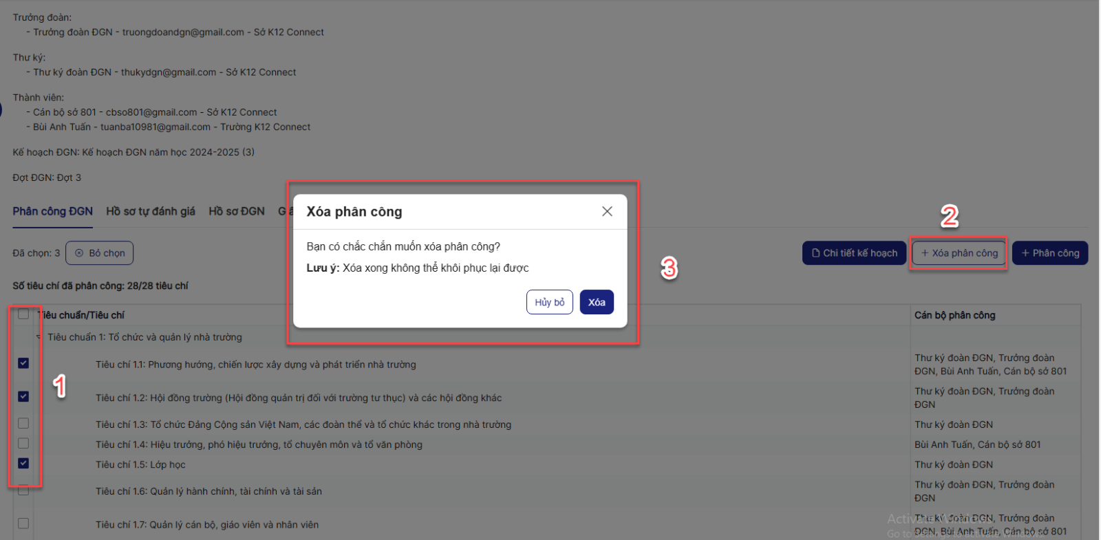 Bước 2: click tab Phân công ĐGN > Trên màn hình, tích chọn các tiêu chí muốn xóa phân công > click Xóa phân công > Hệ thống hiển thị popup xác nhận xóa
