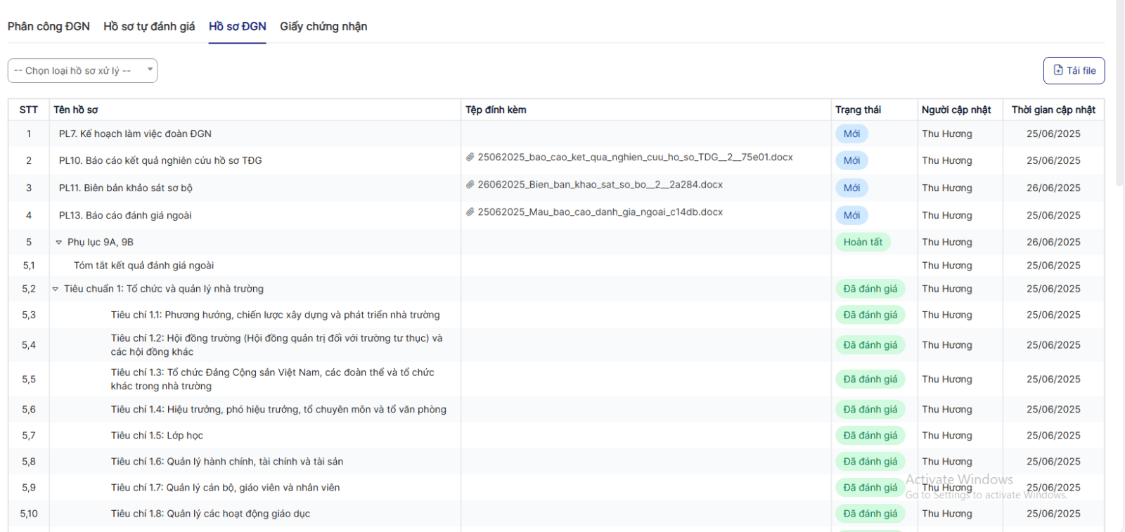+ Thực hiện tải file để tải file các hồ sơ