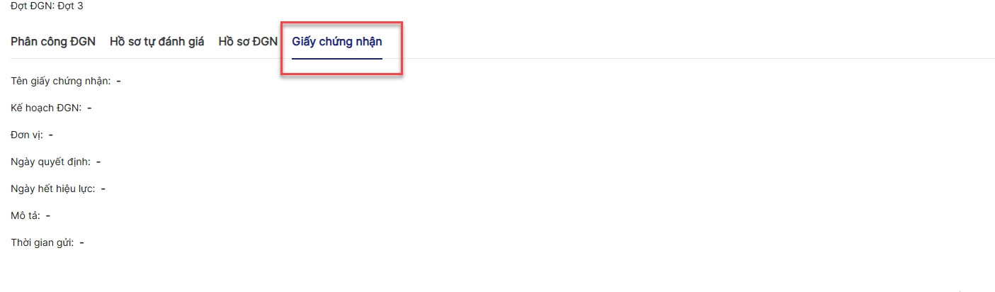 Bước 2: click tab Giấy chứng nhận > Trên màn hình, xem Giấy chứng nhận, nếu chưa có giấy chứng nhận, các thông tin của giấy chứng nhận để trống
