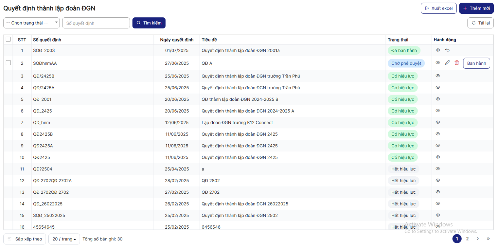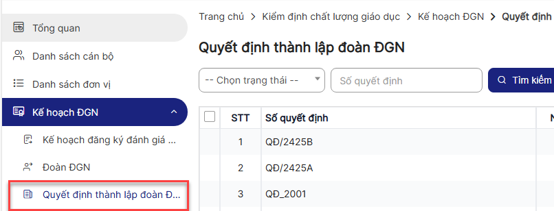 Bước 4: Hiển thị danh sách Quyết định thành lập đoàn ĐGN