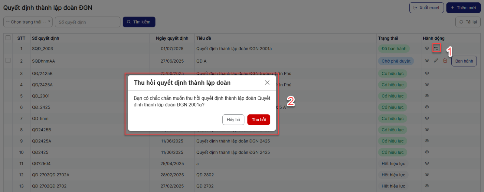 Bước 1: Trên màn hình danh sách > Click icon thu hồi một bản ghi > Hệ thống hiển thị popup xác nhận thu hồi