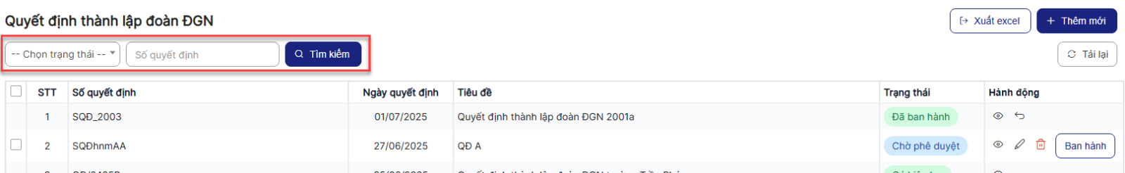 3.7. Tìm kiếm Quyết định thành lập đoàn ĐGN