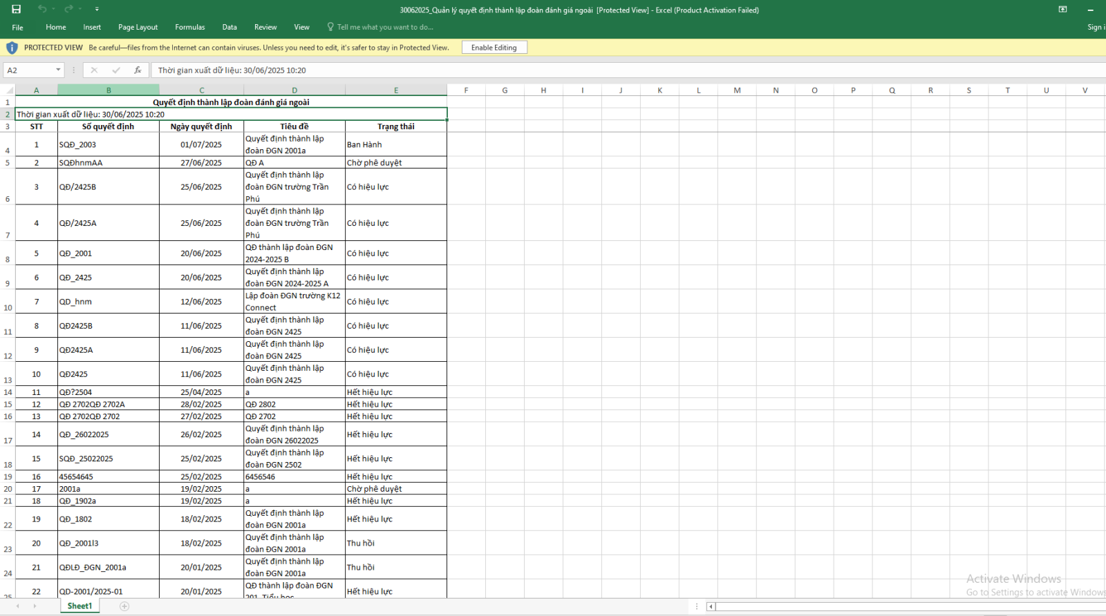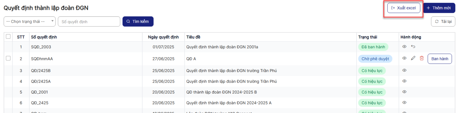 3.8. Xuất excel Quyết định thành lập đoàn ĐGN