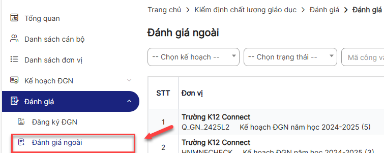 Bước 3: Click menu Kế hoạch ĐGN > Kế hoạch đăng ký đánh giá ngoài