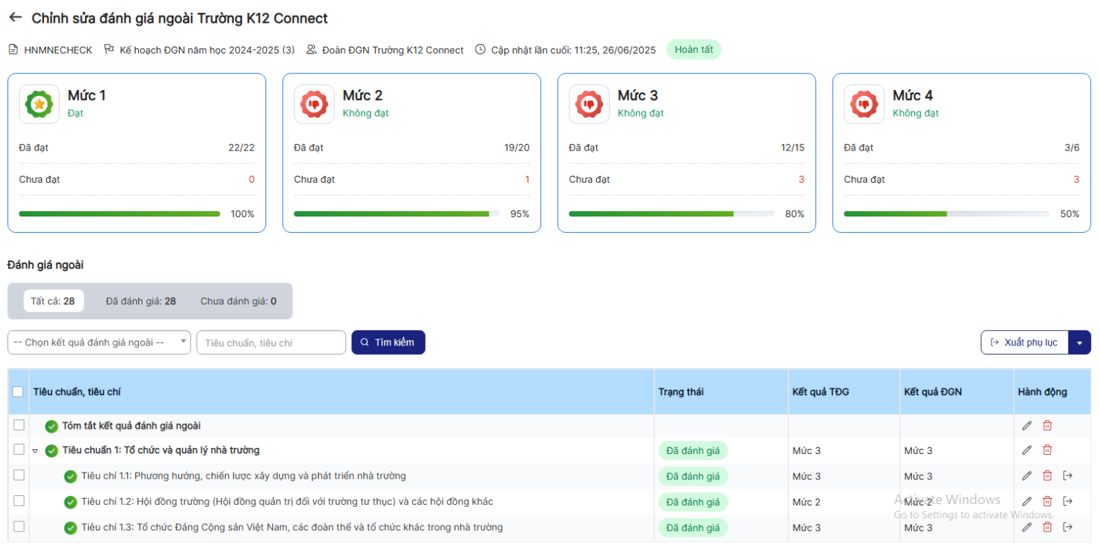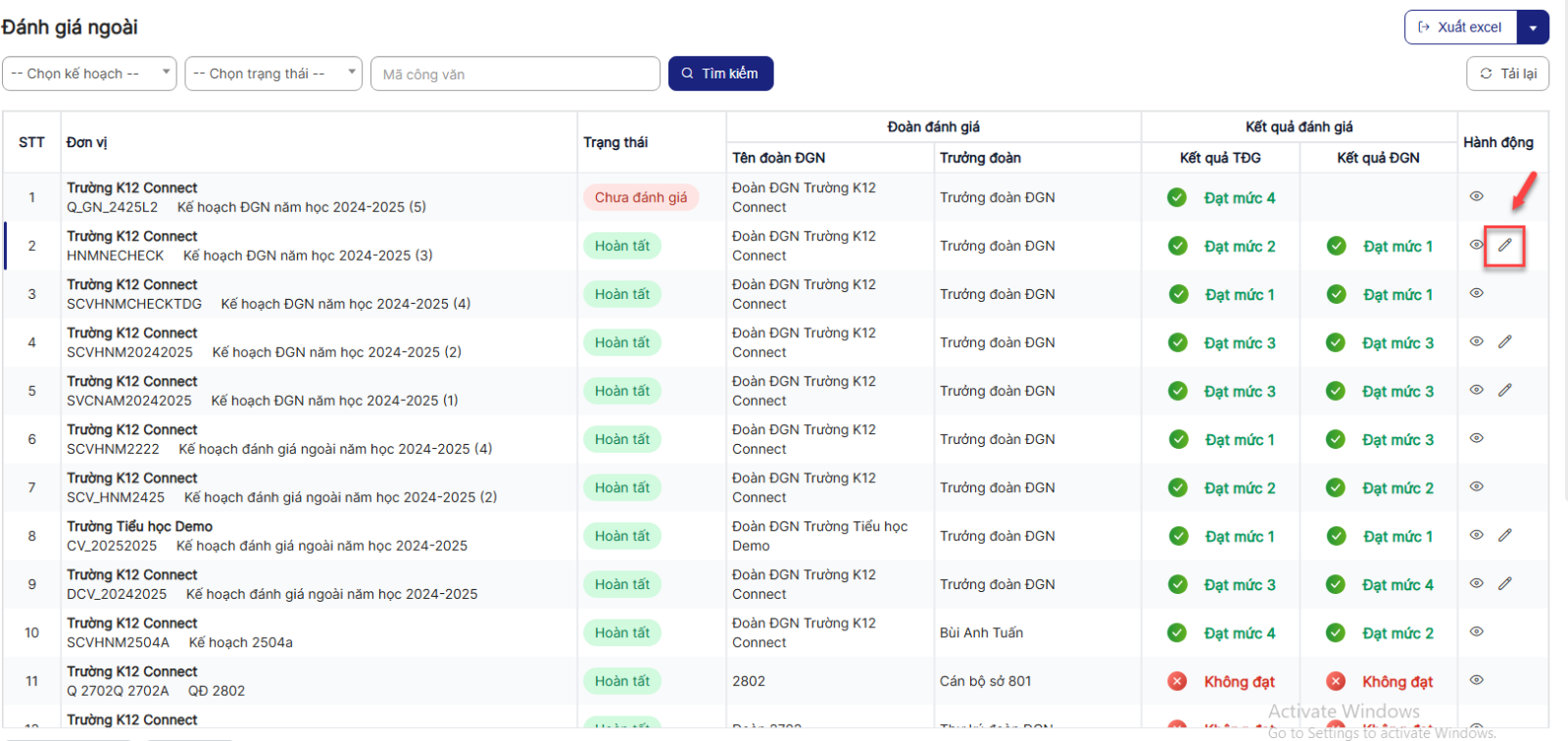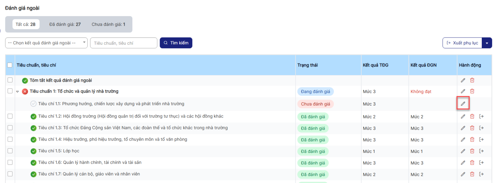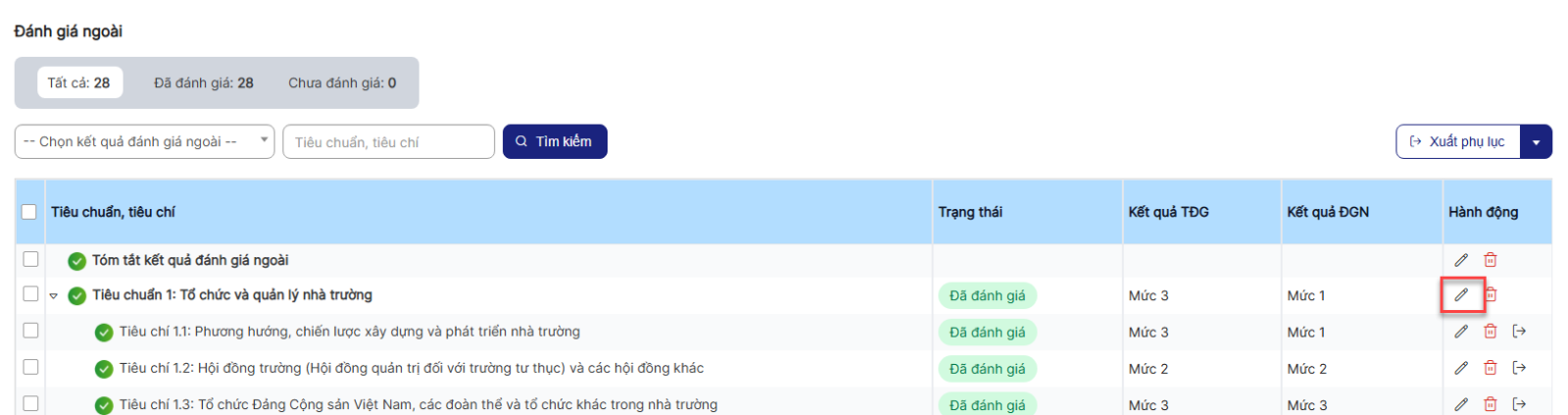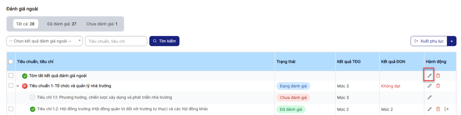 Bước 4: Hiển thị danh sách Đánh giá ngoài > click icon chỉnh sửa 1 bản ghi