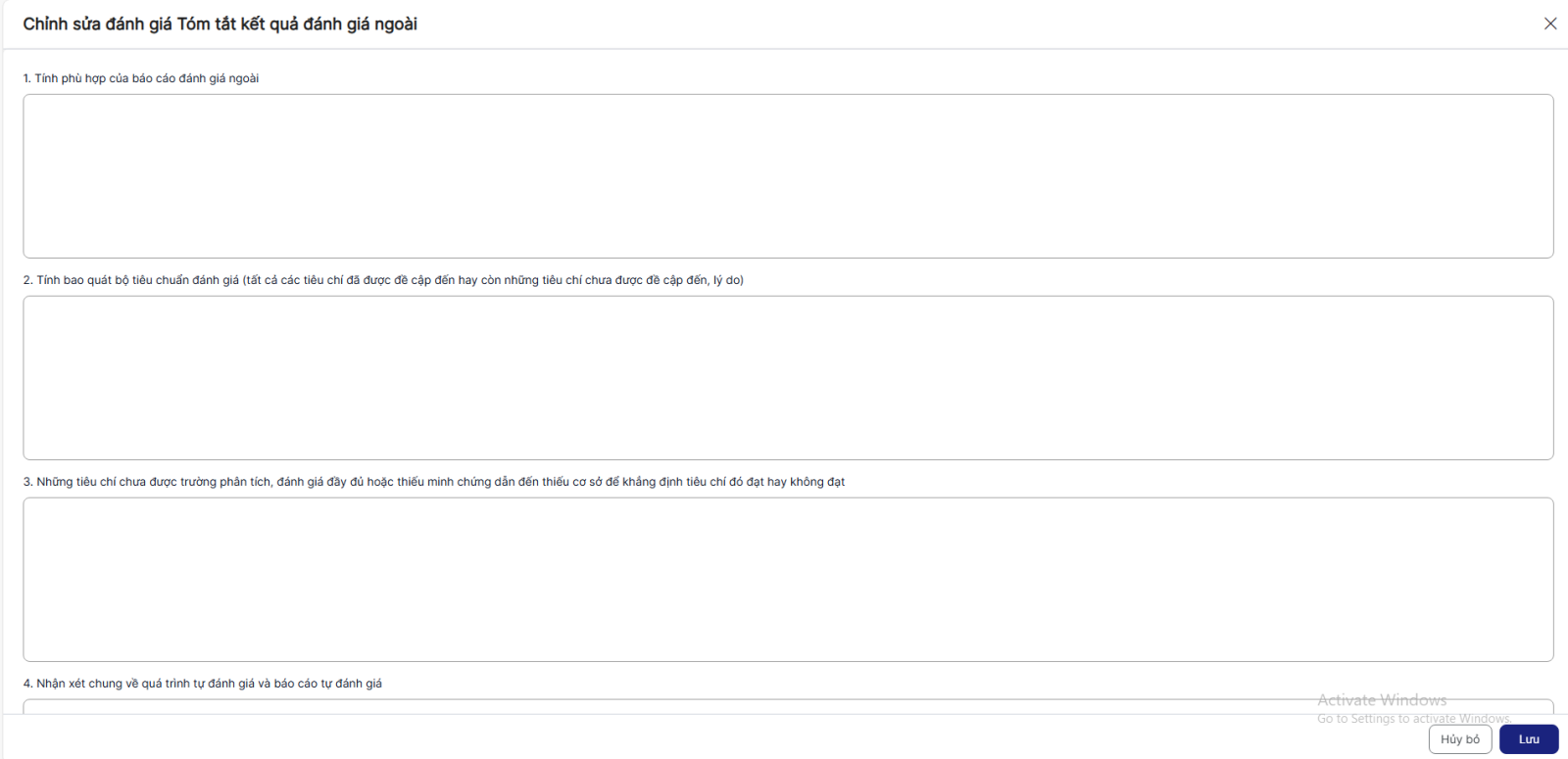 + 4. Nhận xét chung về quá trình tự đánh giá và báo cáo tự đánh giá: không bắt buộc, cho phép nhận không giới hạn ký tự
