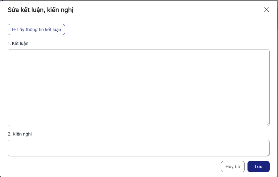 + Lấy thông tin kết luận: click để lấy thông tin kết luận thống kê từ hệ thống vào 1. Kết luận
